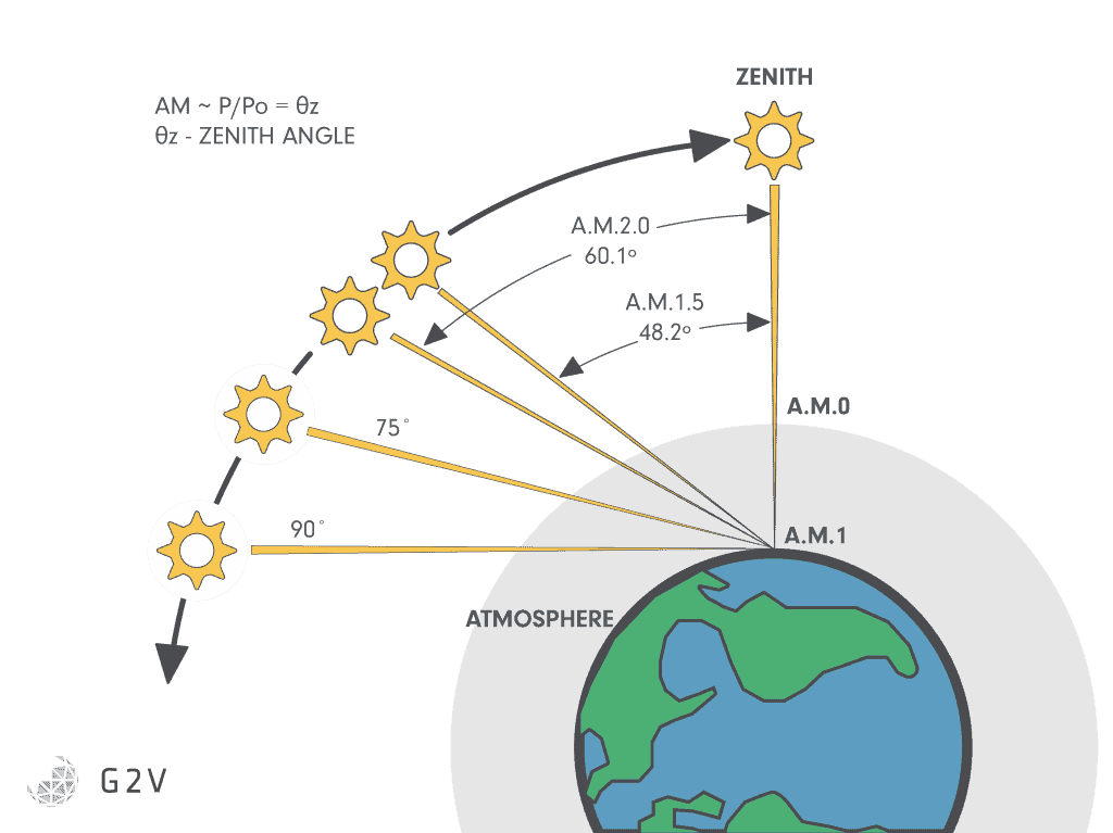 AM1.5G là một chỉ số được sử dụng để mô tả điều kiện ánh sáng mặt trời khi thử nghiệm hiệu suất của các thiết bị năng lượng mặt trời. Chữ "AM" viết tắt của "Air Mass," và số "1.5" đại diện cho độ dày của khối khí trong không khí mà ánh sáng mặt trời phải đi qua để đến đất. "G" đại diện cho "Global tilt," ngụ ý rằng ánh sáng được xem xét dưới góc độ tương ứng với một bảng phẳng nghiêng.