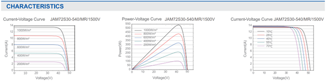 Biểu đồ 1 cho biết khi cường độ ánh sáng tối đa 1000W/m2 thì Công suất có thể tạo ra khi đó tối đa ở mức khoảng 13*42 ~ 546W. Biểu đồ 2 cho biết với mức tương tự với công suất. Biểu đồ 3 cho biết công suất cực đại với đường nhiệt độ cho biết các thông tin tương tự