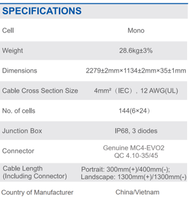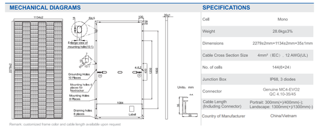 - Chiều dài kết nối giữa các tấm pin bao gồm cả mối kết nối Cable Length (including connector) ➥ Nếu lắp tấm pin theo chiều dọc 300mm với cực dương, 400mm với cực âm. Nếu lắp tấm pin theo chiều ngang 1300mm với cực dương, 1300m với cực âm
