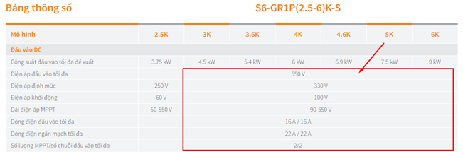 Ví dụ 1: Inverter Solis 5KW không thể lắp vượt quá “Điện áp đầu vào tối đa 550V” tức nhỏ hơn hoặc bằng 11 tấm pin JA540W mắc nối tiếp. Các inverter công suất cao hơn có thể cho phép cao hơn như inverter Solis 110KW có thể lên đến 1100V