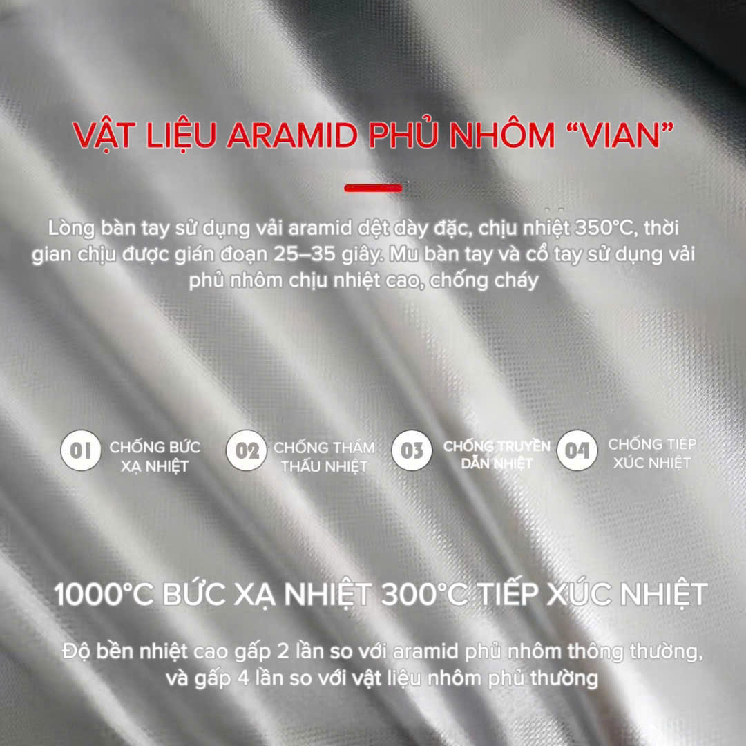 Chất liệu: Vải sợi aramid dệt đặc biệt, phủ lớp nhôm bạc phản nhiệt.