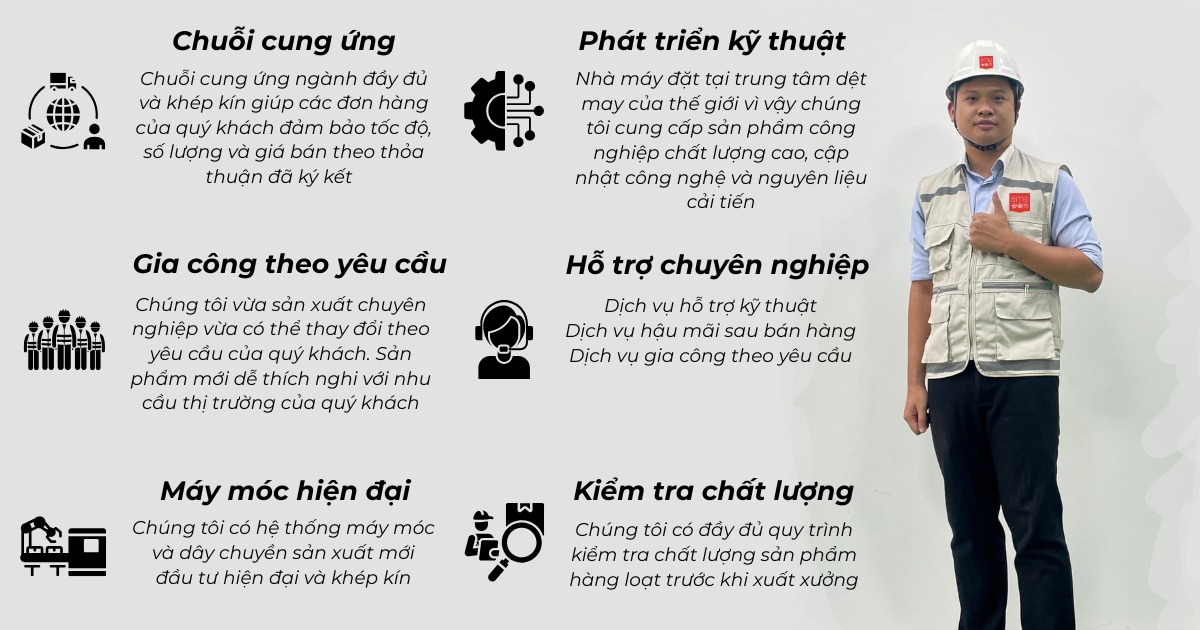 Chuỗi cung ứng: Chuỗi cung ứng ngành đầy đủ và khép kín giúp các đơn hàng của quý khách đảm bảo tốc độ, số lượng và giá bán theo thỏa thuận đã ký kết