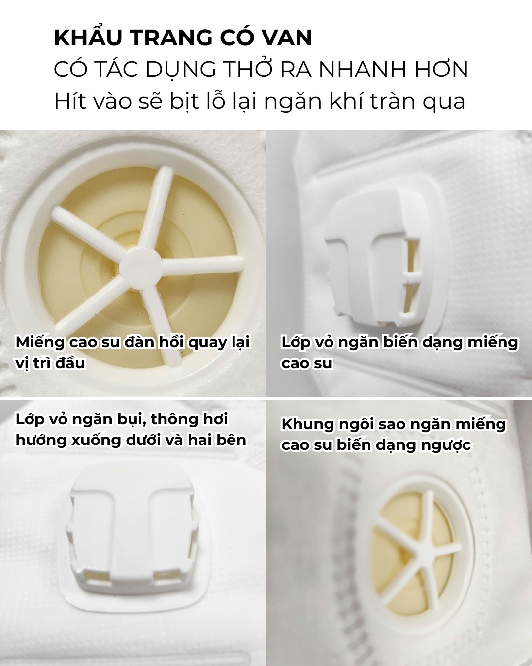 KHẨU TRANG CÓ VAN CÓ TÁC DỤNG THỞ RA NHANH HƠN Hít vào sẽ bịt lỗ lại ngăn khí tràn qua Sản phẩm có đủ chứng chỉ an toàn, chứng chỉ kiểm định ạ. Đã bán cho nhiều nhà máy lớn như Foxconn, Huawei... ạ